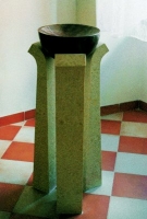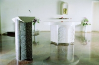 Pracoval jsem na kamenném oltáři, ambónu, svatostánku a sedes do roku 1996, kdy byl nový oltář o velikonocích vysvěcen. Snažil jsem se o napětí vyklenuté, leštěné, mramorové plochy v protikladu s hrubě opracovaným povrchem. Použitý je italský bílý mramor Botticino a český temně červený Slivenecký mramor.