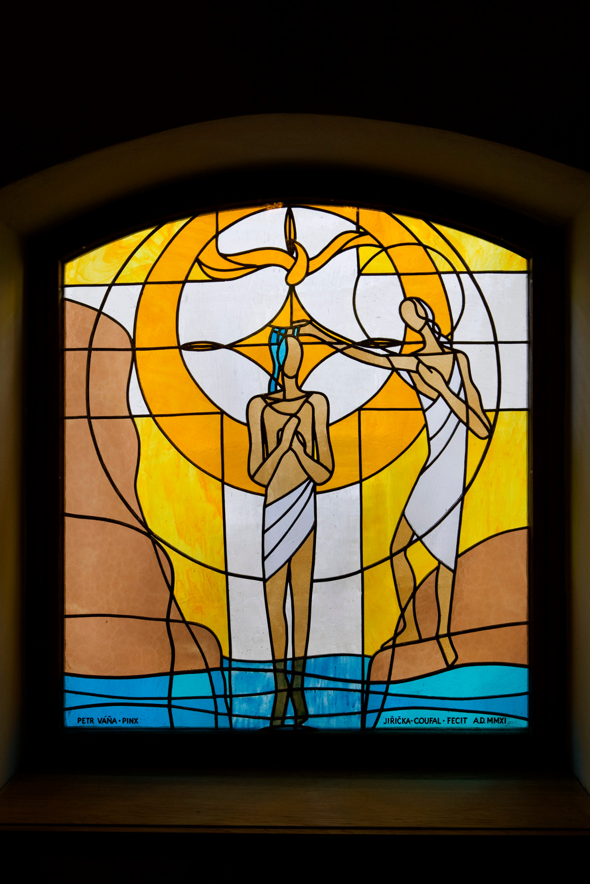 K návrhu vitráží mě přiměly sestry Boromejky, které ve svém areálu nemocnice pod Petřínem v Praze vybudovaly novou kapli. Tři velká okna o rozměrech 120 x 210 cm, možnost vlastní volby tématu i pro mne nový způsob vyjádření byly velkou výzvou. Nakreslil jsem svůj pohled na příběh Panny Marie v čase a sestry Boromejky jej přijaly. V prvním okně z levé strany je Zvěstování . Je to sestupování. Modrá barva je mariánský symbol a bílá sféra ji obklopuje. Prostřední okno je Nanebevzetí. Modrá barva je tažena vzhůru a bílá, jiskřivá sféra ji přijímá. Je to vystupování. Třetí okno je Zůstávání. V bílé přítomné, jiskřící sféře je pramen modré, který zde zůstává v krajině Země, kde se odehrály oba předchozí děje.